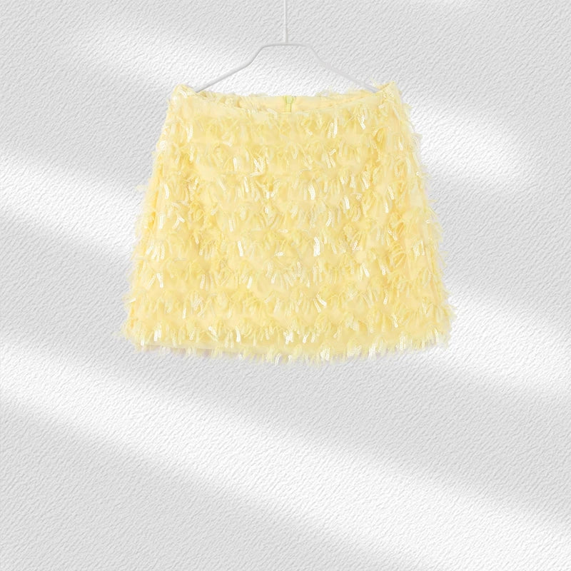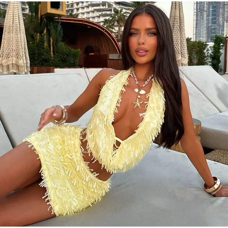 כולל טופ הולטר פתוח בגב וחצאית מיני מחטבת עם פאייטים נוצצים שמחזירים אור מכל כיוון ✨